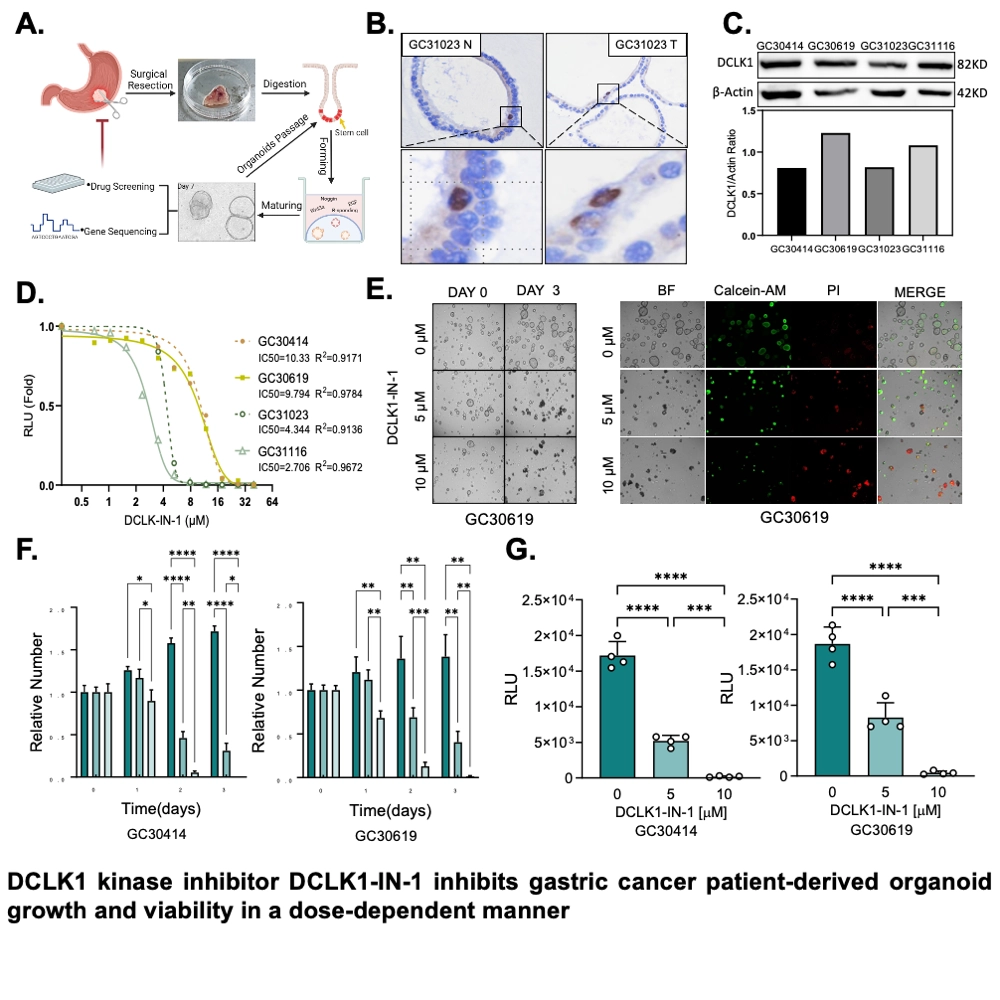 IHC staining showed that DCLK1 was specifically expressed in GC PDOs. After DCLK1-IN-1 intervention, significant inhibition of PDO number and viability was revealed.