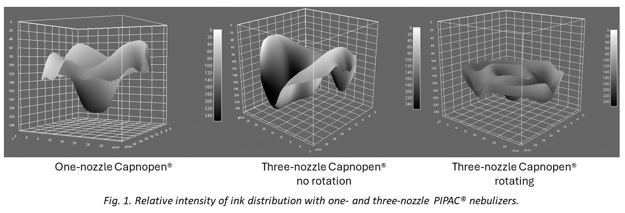 After PIPAC with the Capnopen® (Capnopharm, Tübingen, Germany), heterogeneous drug distribution was reported. To improve drug distribution, we developed a three-nozzle nebuliser (“Triplepen”) and compared the performance of both devices ex-vivo.