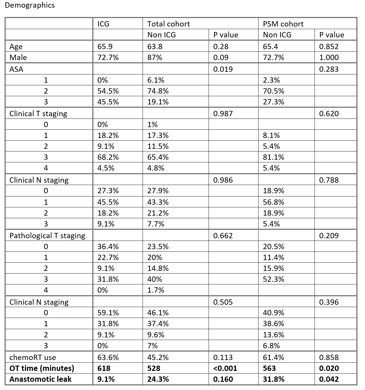 The anastomotic leak rate was 9.1% in the ICG group vs 31.8% in the non-ICG group after PSM (p = 0.042). The operative time was significantly longer for the ICG group (618 vs 563 minutes, p=0.02). Within the ICG group, anastomosis at a site with ICG signal within 60 seconds of injection significantly reduces anastomotic leakage (p=0.001). Gastric tube length and perfusion length at different time points were not significant predictors of anastomotic leakage in this cohort.