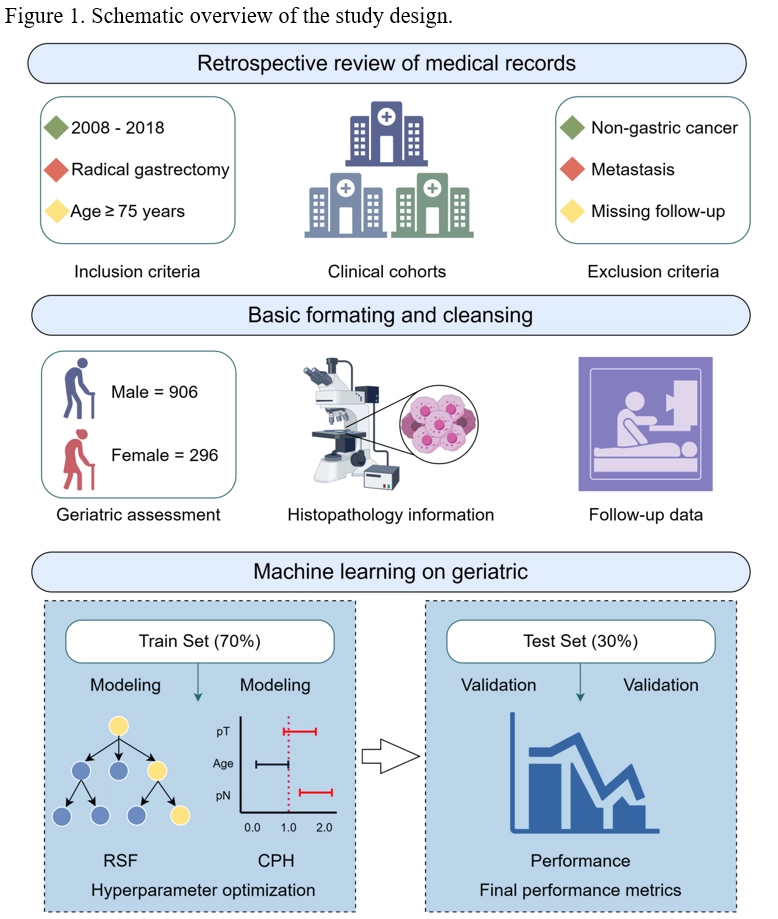 This multicenter retrospective study analyzed data from elderly patients who underwent radical gastrectomy at nine tertiary medical centers from 2009 to 2018. Patients were randomly assigned to training and testing groups. Core variables were selected using Random Forest (RSF) methods, and both RSF and Cox Proportional Hazards (CPH) models were used to predict overall survival (OS) and disease-free survival (DFS). Validation, calibration, and discrimination were performed using bootstrap resampling.
